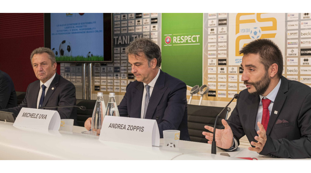 Alla presenza degli Eccellentissimi Capitani Reggenti Oscar Mina e Paolo Rondelli, la FSGC ha svelato ufficialmente, e nel dettaglio, il suo Progetto di Responsabilità Sociale, con ambiziosi obiettivi dedicati ai macro temi dei diritti umani e della sostenibilità ambientale, tutti fissati per l'anno 2030. Questo contenitore, modellato sulla Football Sustainability Strategy di UEFA, ha nella Federcalcio di San Marino una sorta di centro-laboratorio (assieme ad altre cinque Federazioni medio-grandi) per una missione che presto vedrà coinvolte anche le altre Federazioni affiliate a UEFA. Una grande responsabilità per la FSGC, che ha allestito l'evento di presentazione nella Sala Stampa del San Marino Stadium, con la partecipazione al desk di Michele Uva - Direttore Division UEFA di Football & Social Responsibility – del presidente federale Marco Tura, del Segretario di Stato allo Sport Teodoro Lonfernini e del Football Social Responsability Officer della FSGC Andrea Zoppis. In platea i dirigenti e i responsabili dei club e delle associazioni che collaborano con le iniziative della FSGC, la cui partecipazione attiva costituirà uno dei requisiti essenziali per la buona riuscita del progetto stesso, come rimarcato dallo stesso Uva nel corso del suo intervento. Prima però è toccato al Presidente Tura fare gli onori di casa. Il numero uno della Federcalcio ha elencato i principi generali di un'iniziativa che si iscrive nel solco di un impegno sociale, quello della FSGC, nato fin dal 2016 e poi proseguito negli anni con tappe che hanno portato in dote anche riconoscimenti internazionali, come ad esempio il Cafè Award del 2021, per aver migliorato l'accessibilità agli stadi dei tifosi ciechi tramite la messa a disposizione di telecronache audio-descrittive. La palla è poi passata al Segretario Lonfernini, che ha allargato il campo delle considerazioni definendo questo progetto un valore aggiunto non solo per il sistema-calcio di San Marino, ma per l'intero sistema-Paese, nella certezza che i suoi valori sapranno attecchire bene e portare frutto all'interno di una comunità da tempo sensibile a queste tematiche.